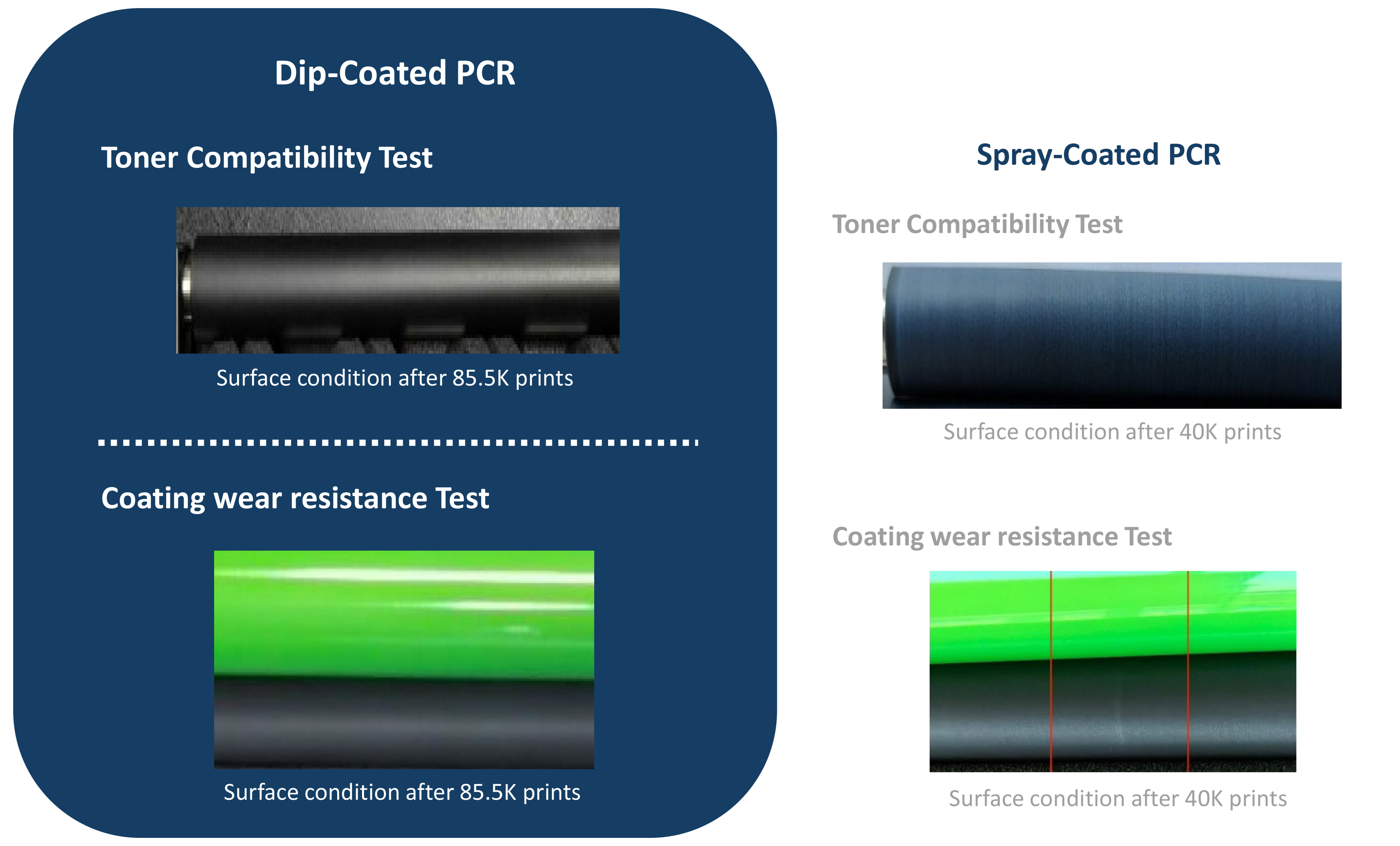 Toner compatibility: The microporous structure produced by spray coating allows wax in toner to penetrate the layer, causing whitening and degrading print quality. By tailoring polymer molecular-weight distribution, dip coating builds a dense yet elastic surface. Tests demonstrate that dip-coated PCRs are compatible with toner from multiple brands, preventing print-quality issues caused by toner incompatibility while enhancing equipment applicability and flexibility.