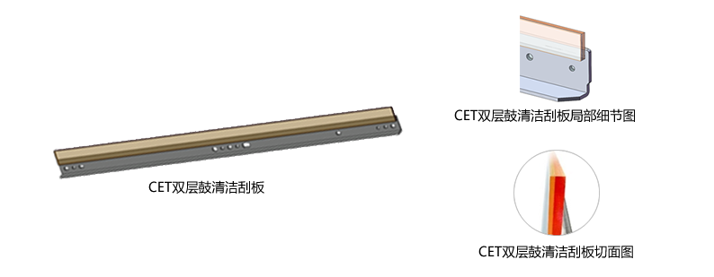 CET套鼓运用自主研发的核心配件,从根源上提升产品的兼容性与耐用性。其中,独家研制的双层鼓清洁刮板采用双层结构设计,借助两层不同硬度材质的协同配合,清洁效能突破单层结构的局限,既能高效清除鼓芯表面的残余废粉,又能在不损伤鼓芯的前提下稳定提供支撑力,有效避免在高速机上出现刮板翻转的问题。CET双层鼓清洁刮板性能卓越,可满足更高品质的打印需求,同时能显著延长鼓芯的使用寿命,降低用户的维护频次和成本。