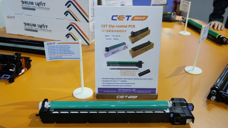 值得一提的是,CET首款搭载自主研发浸涂充电辊的GPR - 53/NPG - 67/C - EXV49套鼓在展会上首次亮相,吸引了众多客户关注。CET全新研发的浸涂PCR有效突破了采用喷涂技术的PCR所面临的技术瓶颈,实现了图像与浓度控制的双重提升。该技术显著改善了低温打印与底灰控制表现,进一步增强了产品抗磨损与碳粉兼容性。这一创新成果不仅大幅提升了打印设备的核心性能,更为行业树立了全新的质量标杆。